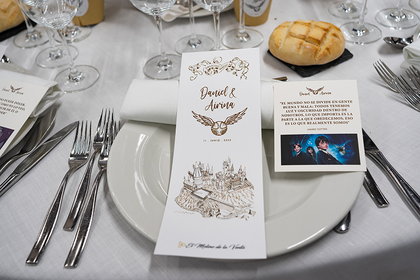 Airina y Dani decidieron celebrar su boda inspirada en el maravilloso mundo de Harry Potter y la idea cuando me la contaron no me pudo gustar más. Para ello lo que buscamos fue añadir pequeños rincones o toques decorativos durante toda la celebración que ayudara a recordar y transportarnos al mundo mágico siempre desde un punto de vista elegante y romántico.